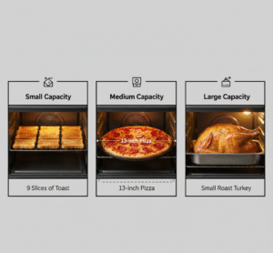 - Capacity: Interior size matters, from fitting a 13″ pizza to handling half-size pans.