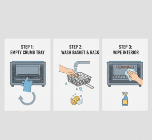 - Crumb trays & baskets → Empty and wipe after each use to prevent buildup and smoke.
